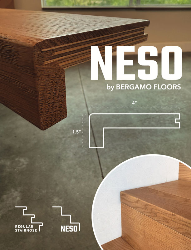 Neso stair nosing features a sleek, lipless design that provides a clean and modern finish to any stairs using Bergamo Floors. Ideal for installations where a smooth transition is desired, it sits flush with the edge of the stair without protruding over the tread, ensuring a seamless aesthetic. Crafted from Bergamo Floors planks, Neso is both wear-resistant and visually discreet, making it a perfect choice for projects seeking a minimalist look.